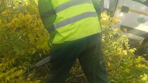 Radnici RJ "Zelenilo" na uklanjanju visokog rastinja na raskrsnici kod nove opštine uz primene svih mera bezbednosti i njihovog uticaja na saobraćaj.