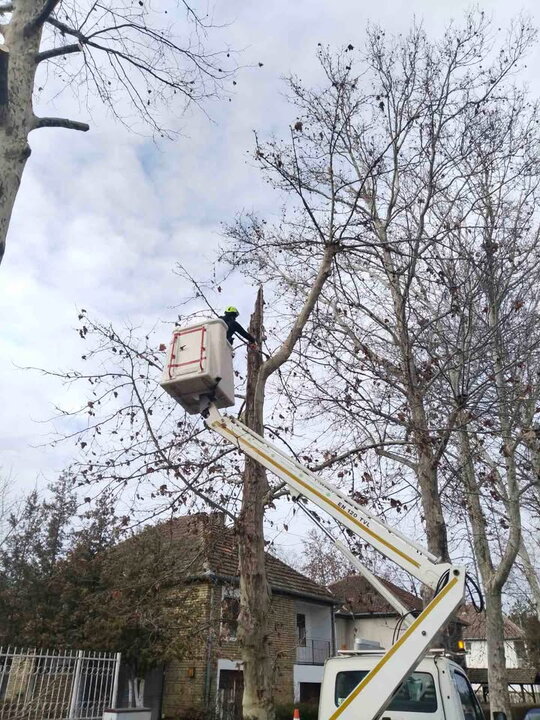 Po dobijenom inspekcijskom rešenju, radnici RJ „Zelenilo“ vrše orezivanje stabala ispod elektro-energetskih vodova u Travničkoj ulici u Subotici.