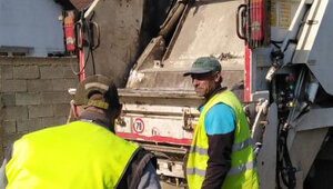 Radnici RJ „Sakupljanja i odvoženja komunalnog otpada“ angažovani na pražnjenju malih kontejnera zapremine 1,1 m³ i većih zapremine 5 m³ u ulici Matka Vukovića mesne zajednice Donji Tavakut.