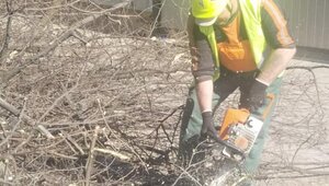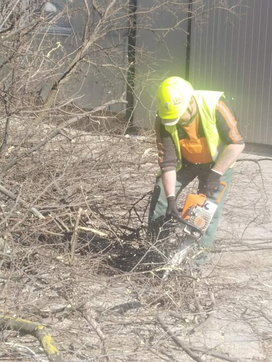 Radnici RJ "Zelenilo" na uklanjanju visokog rastinja na raskrsnici kod nove opštine uz primene svih mera bezbednosti i njihovog uticaja na saobraćaj.